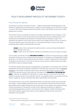The Internet Society’s policy positions and approaches are grounded in our historical role in Internet development and mission statement, enhanced by community input, and true to the core technical invariants of the Internet. In the public policy space, we find that the Internet Society’s unique contribution typically involves issues where we can speak to the intersection of technology and policy – where we can highlight the implications of a policy decision on the future of the “open, globally-connected, secure, and trustworthy” Internet. To be globally relevant, our positions must be topical, scalable (i.e. relevant in Brussels AND Jakarta AND Brasilia), and actionable.