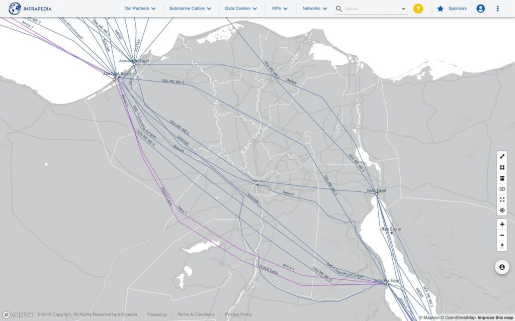 Figure 1: Infrapedia map showing multiple telecommunications cables crossing Egypt